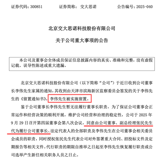 交大念念诺(300851)9月30日公告,公司于近日收到公司董事长李伟家属的告知,其收到由天津市滨海新区监察委员会签发的对于李伟的《留置告知书》,李伟被实践留置。