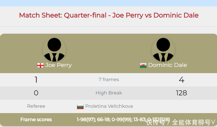 与特鲁姆普的那场决赛,两边在前六局打得绝顶胶著,1-1、2-3、3-3聚积打平。比赛第一局,佩里开局最初发力。他打出单杆60分,但赢得这一局凯旋得分是全国第一,他通过几次上手,70-60三分险胜,1-0卓越。
